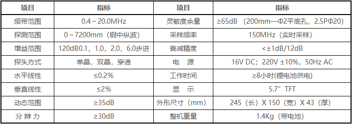 - 缺陷回波參數(shù)(距離、垂直、水平、波幅、dB或當(dāng)量孔徑值)實(shí)時(shí)顯示;多次波探測缺陷的實(shí)際深度可直接顯示。