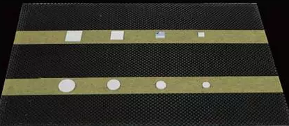北航設(shè)計了一套空氣耦合超聲檢測系統(tǒng),并用此系統(tǒng)檢測了蜂窩夾芯復(fù)合材料,制備預(yù)埋缺陷的紙蜂窩夾芯復(fù)合材料結(jié)構(gòu)試樣如圖所示。試樣蒙皮厚度約為1mm、蜂窩芯厚度約為10mm。蜂窩夾芯復(fù)合材料試樣的空氣耦合超聲C掃描圖像,其中缺陷特征清晰可辨,驗證了空氣耦合超聲檢測技術(shù)應(yīng)用于蜂窩夾芯復(fù)合材料脫粘檢測的可行性。