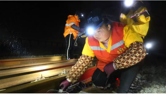 3月4日凌晨,天空下起了雨,柳南客專上下行線K2+000至K8+000公里處,柳州工務段柳州女子探傷班的姑娘們懷抱超聲波焊縫探測儀,對鋼軌焊縫接頭進行探傷。